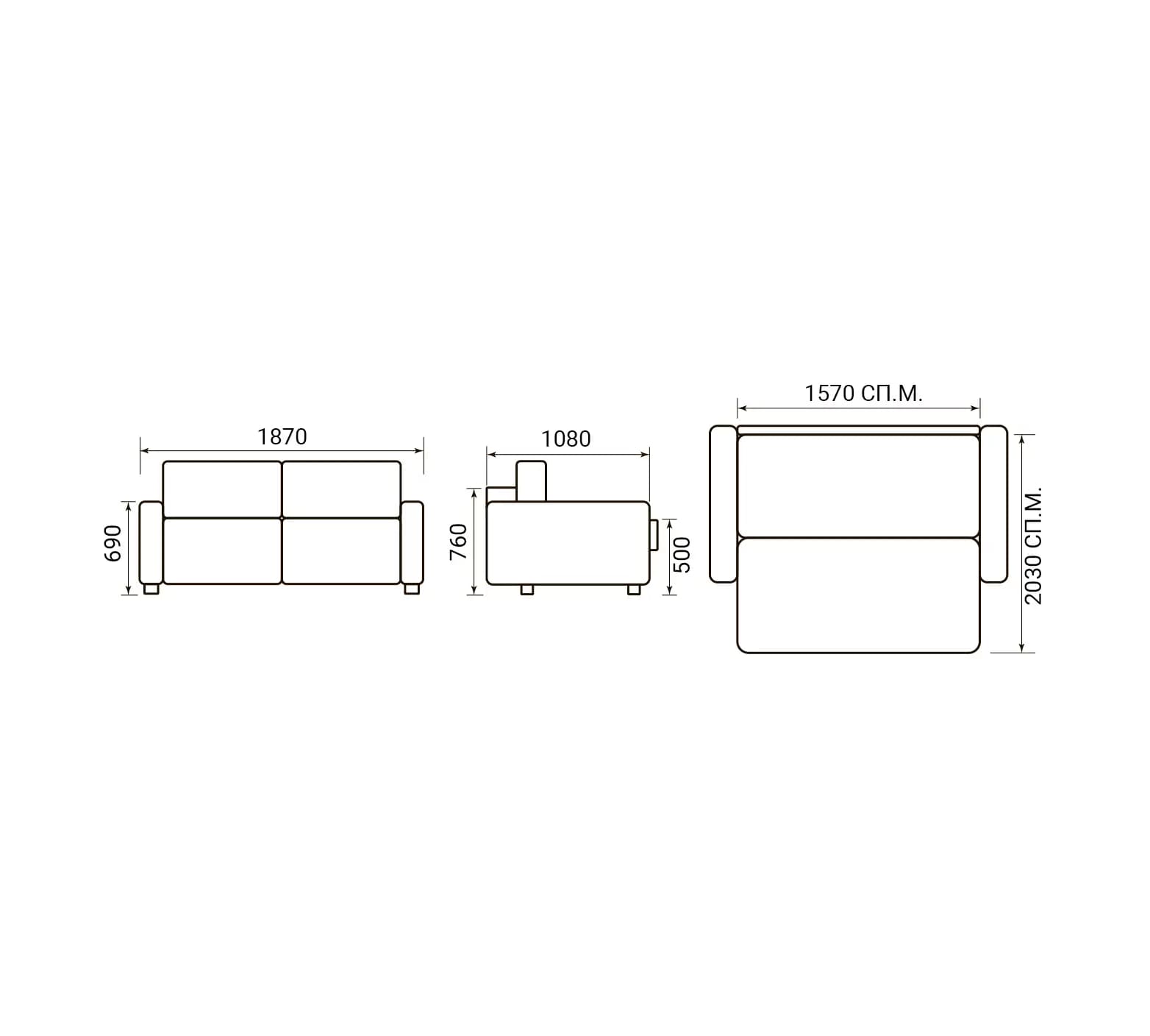 Наповнення: Пружинний блок; Розмір в зібраному вигляді, мм: 2080х1080х780; Розмір в складеному вигляді, мм: 2080х2000х780; Розмір спального місця, мм: 2000х1780.